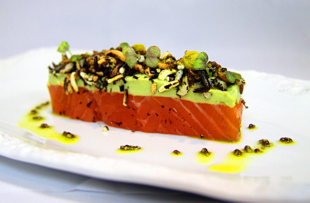 Salmón marinado, con mantequilla de aguacate y avellanas
